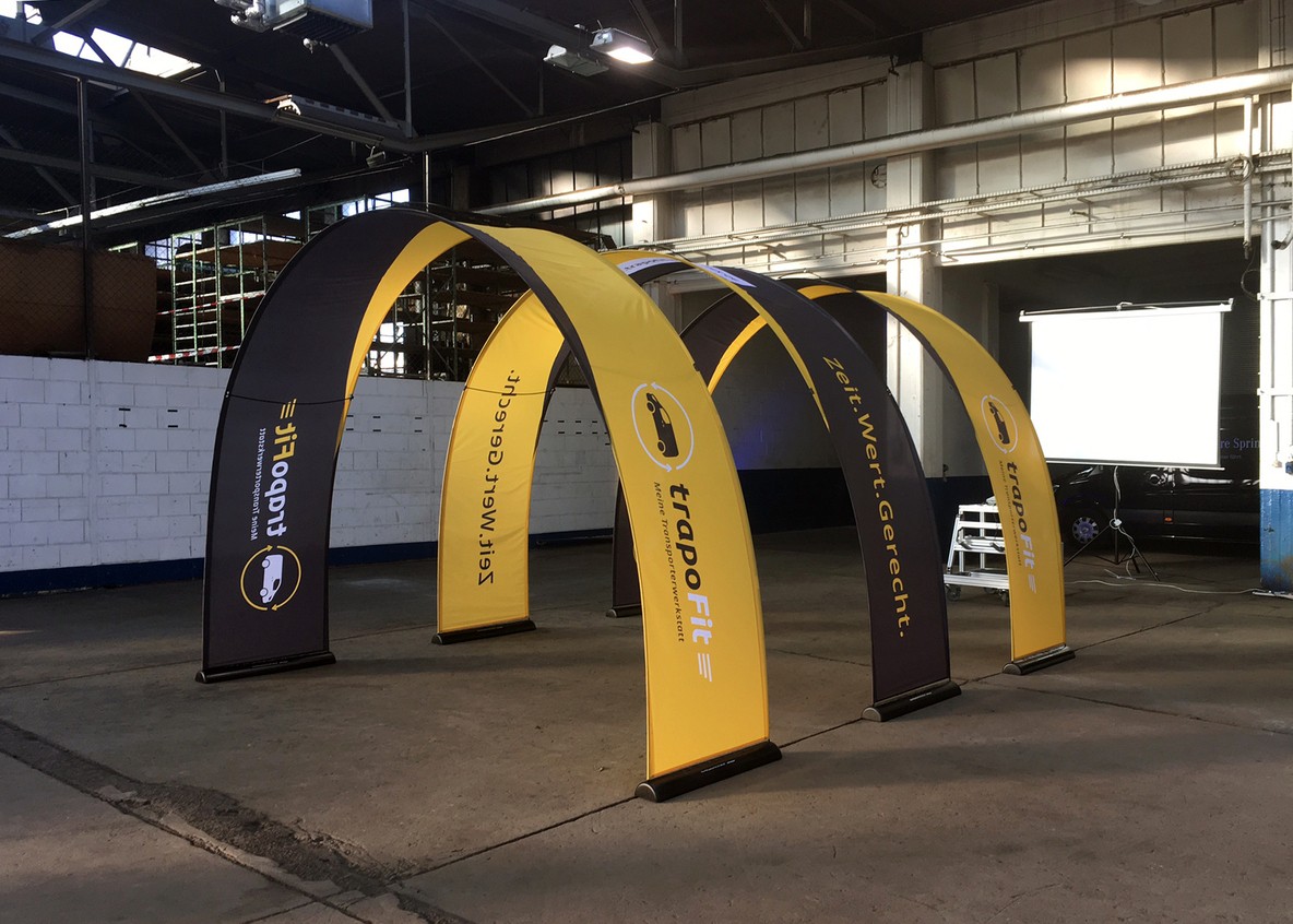 Innovatives Bannerbow-Präsentationssystem mit Textilbespannung bis zu 3,75 Metern Höhe.