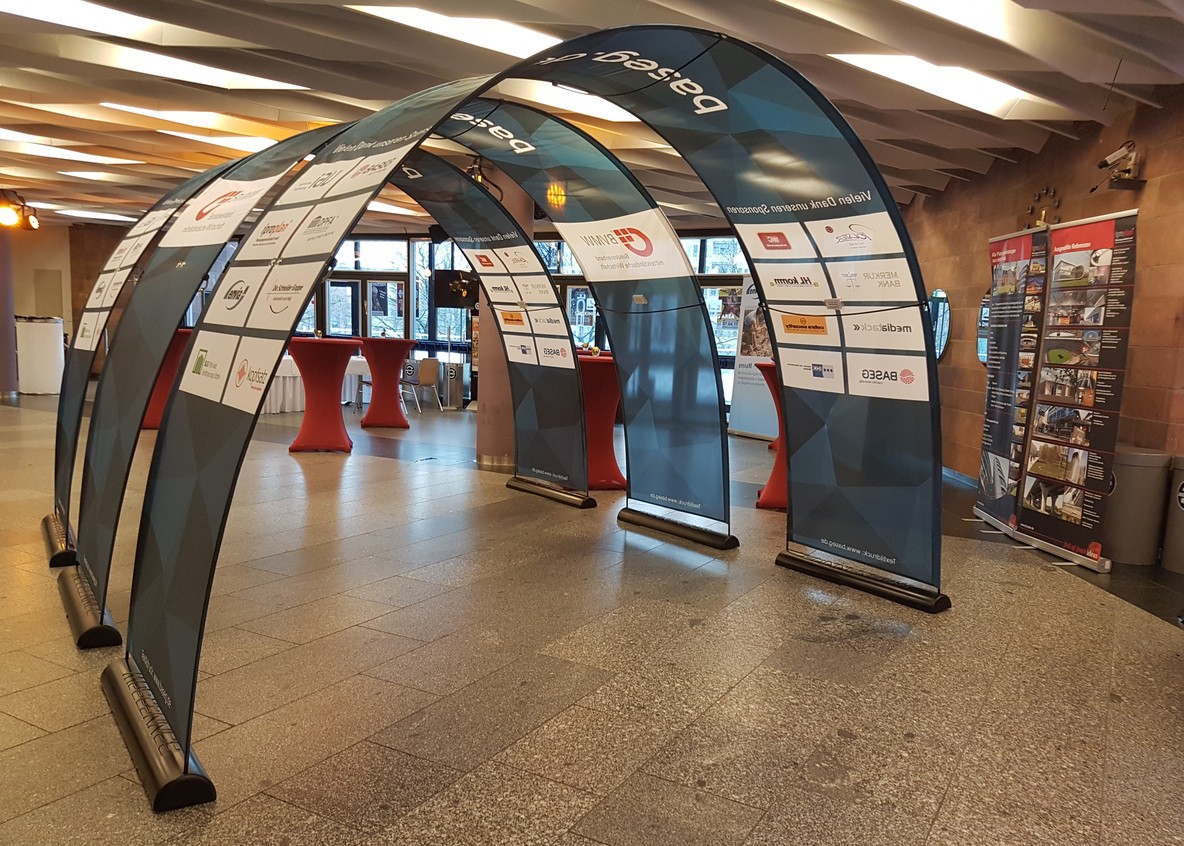 Betreten Sie neue Wege Ihrer Unternehmenspräsentation. Das neuartige Bannerbow-Präsentationssystem gibt Events wie Kundenveranstaltungen oder Messeauftritten eine besondere Wirkung. Das einfach aufzubauende und leicht zu transportierende Bannersystem bietet neue kreative Wege zur Raumgestaltung und zur Gewinnung von Aufmerksamkeit. So können Sie bis zu drei Bannerbows als Torbogen nutzen oder zwei Bannerbows als Kreuzpavillon für Sitz- und Stehgruppen. Die leichte Konstruktion aus Fiberglasstangen wird mit einem individuell bedruckbaren Stoff ausgestattet. So können Sie Ihr Logo, Ihre Botschaft oder ein passendes Motiv in drei verschiedenen Größen und in ungewohnter Form präsentieren.